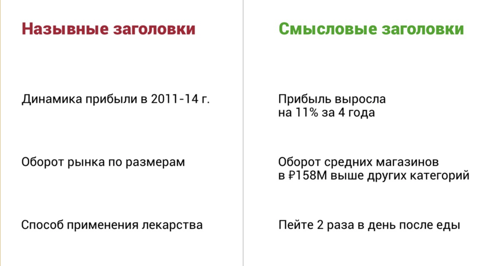 два типа заголовков: назывные и смысловые. Заголовки типа «О компании», «Обзор рынка», «Прогноз» — назывные. Они не сообщают зрителю ценность и лишь в общих чертах задают тему слайда. Остаётся только догадываться, какую мысль хотел донести автор, продираясь через текст и путаные графики.